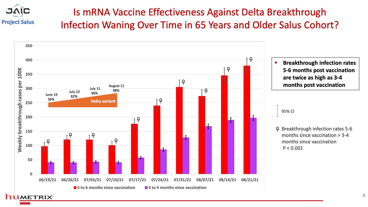 One slide from the analysis reveals that so-called “breakthrough” infections — vaccine failures — increase with time, showing a near doubling of breakthrough infections among those vaccinated 5-6 months ago vs. those vaccinated only 3-4 months ago.