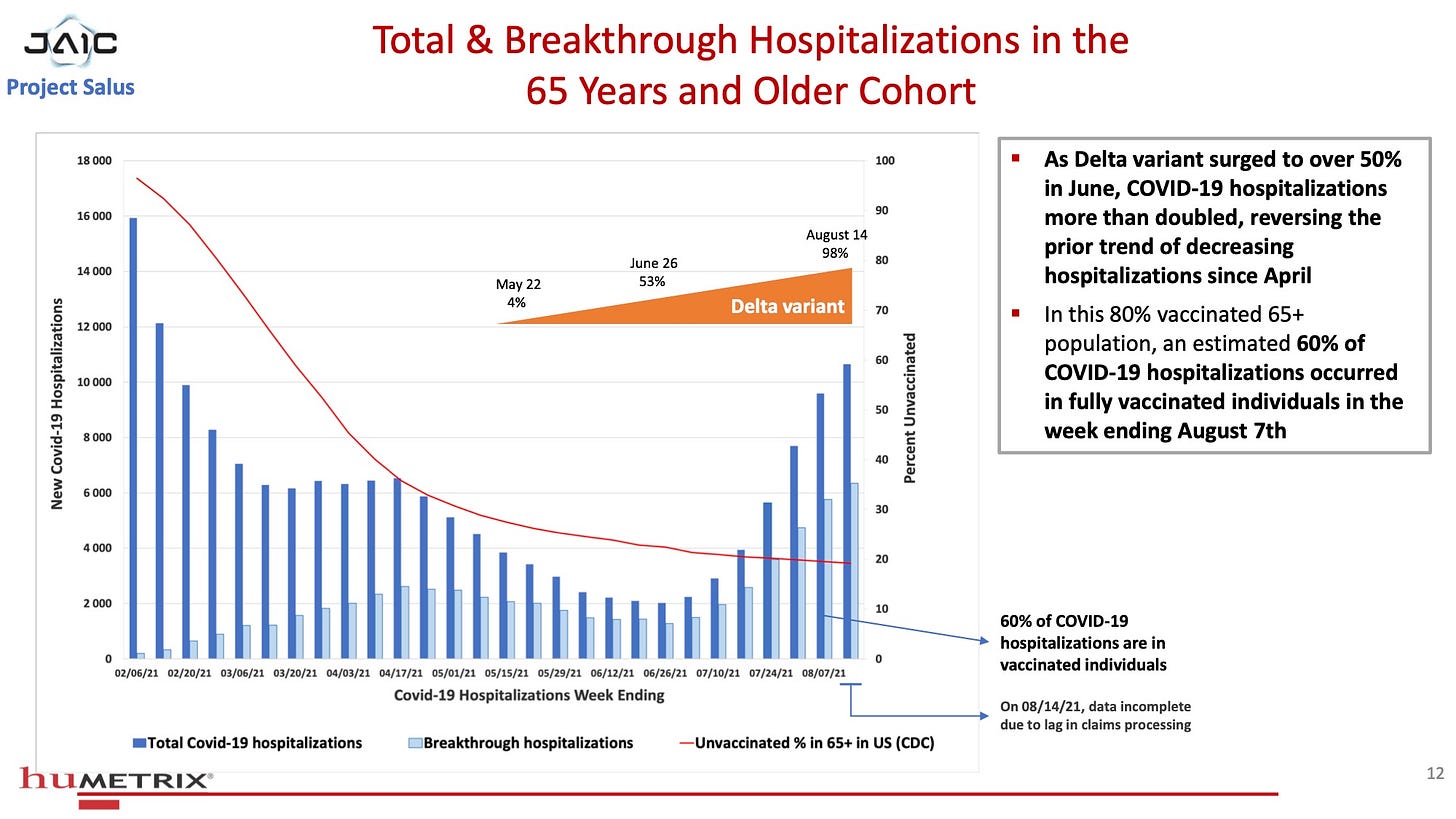 In this 80% vaccinated 65+ population, an estimated 60% of COVID-19 hospitalizations occurred in fully vaccinated individuals in the week ending August 7th.