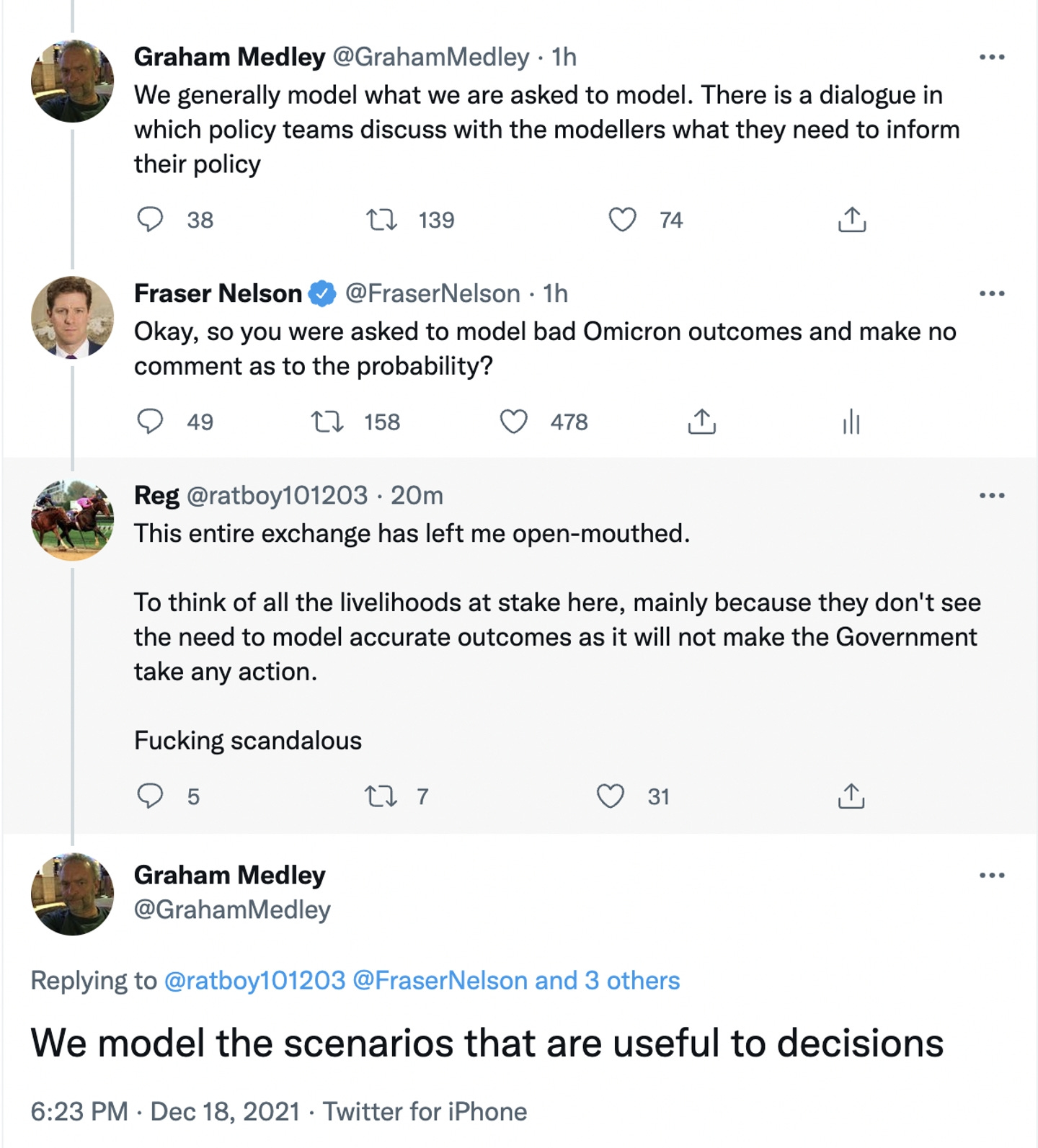 Revealingly, he seemed to think my question odd: if it's quite plausible that Omicron is mild and doesn't threaten the NHS, what would be the point of including that as a 'scenario'? He seemed to suggest that he has been given a very limited brief, and asked to churn out worse-case scenarios without being asked to comment on how plausible they are.