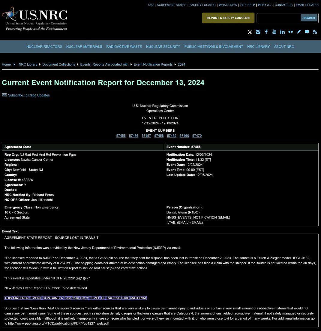 The U.S. Nuclear Regulatory Commission reports radioactive material was LOST in New Jersey. “A radioactive shipping container arrived at destination damaged, empty”