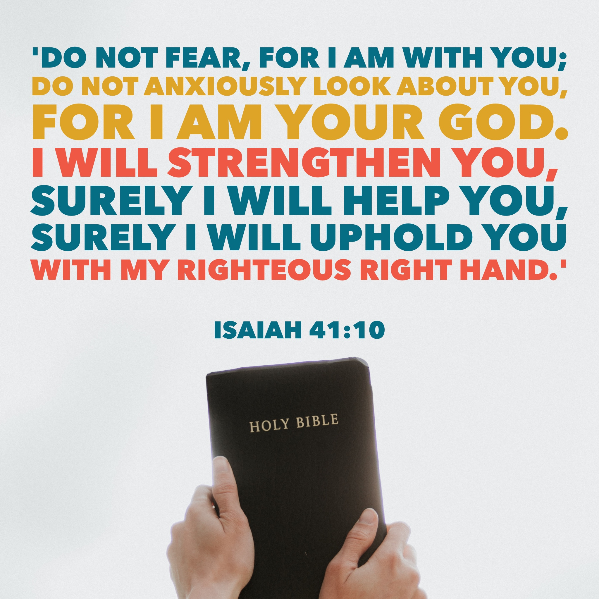 So do not fear, for I am with you; do not be dismayed, for I am your God. I will strengthen you and help you; I will uphold you with my righteous right hand.