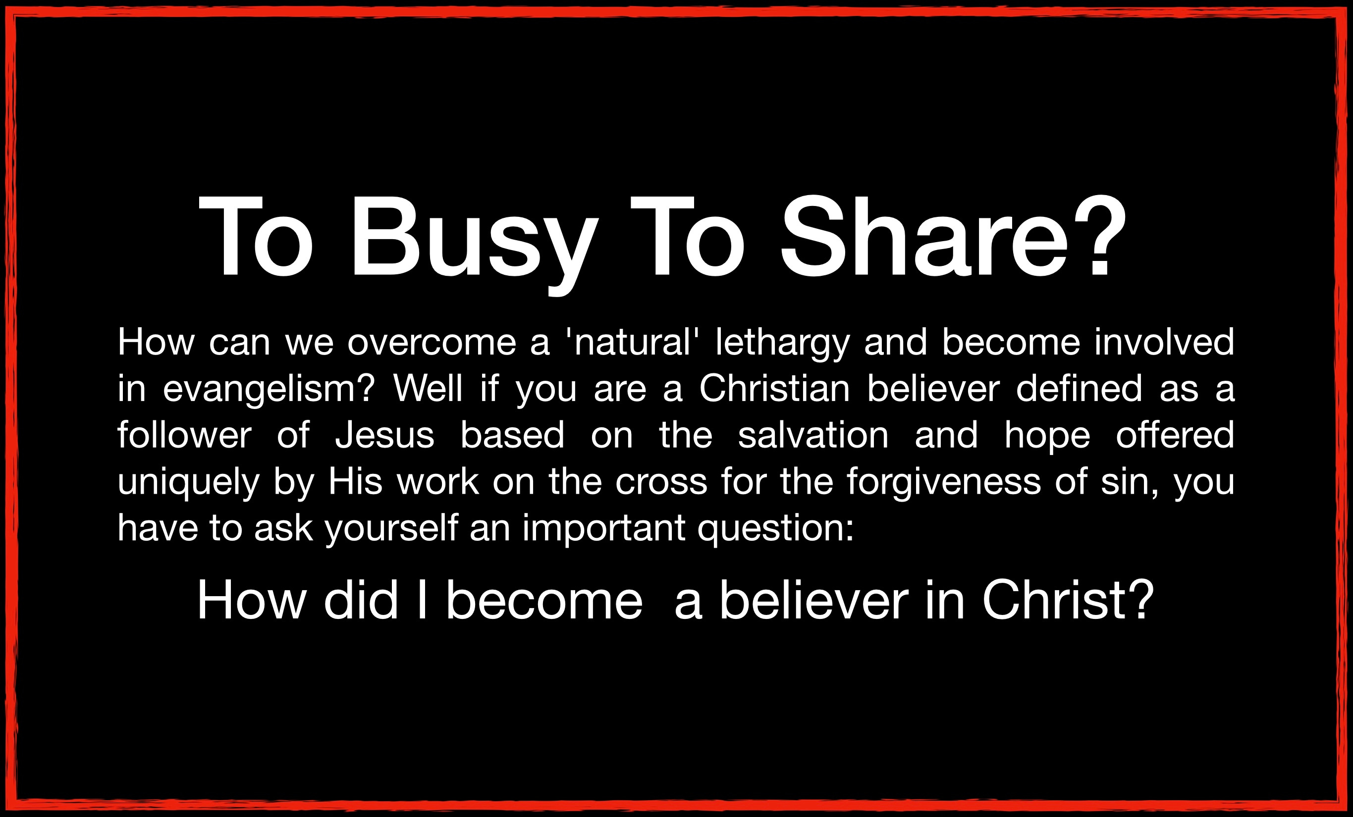 How can we overcome a 'natural' lethargy and get involved in evangelism? Well, to begin with, lets assume that as a person reading this, that you are a Christian believer and follower of Jesus based on the salvation and hope offered uniquely by His work on the cross for the forgiveness of sin.