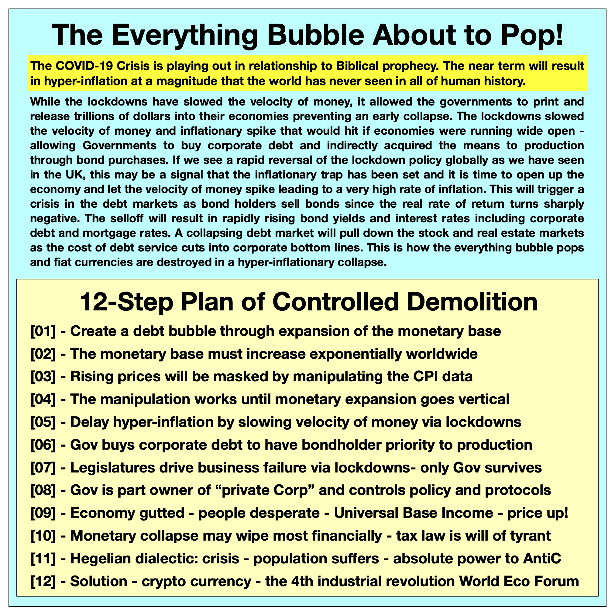 Consider this 12-step sequence of controlled economic demolition: