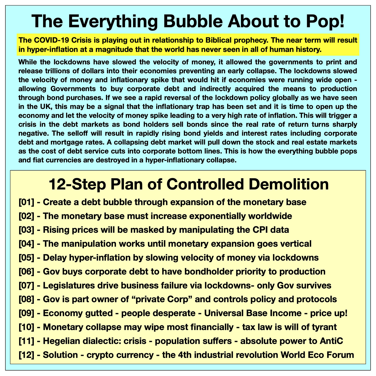 The lockdowns slowed the velocity of money and inflationary spike that would hit if economies were running wide open - allowing Governments to buy corporate debt and indirectly acquired the means to production through bond purchases.