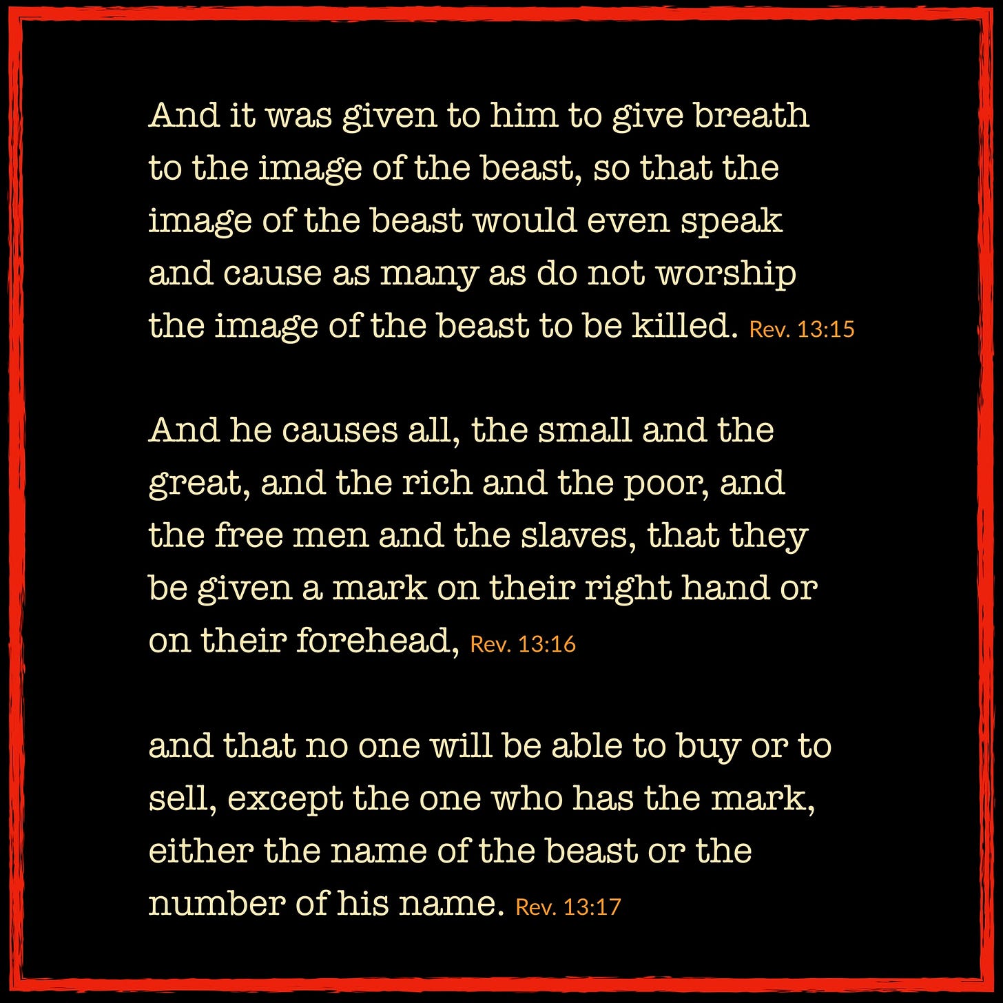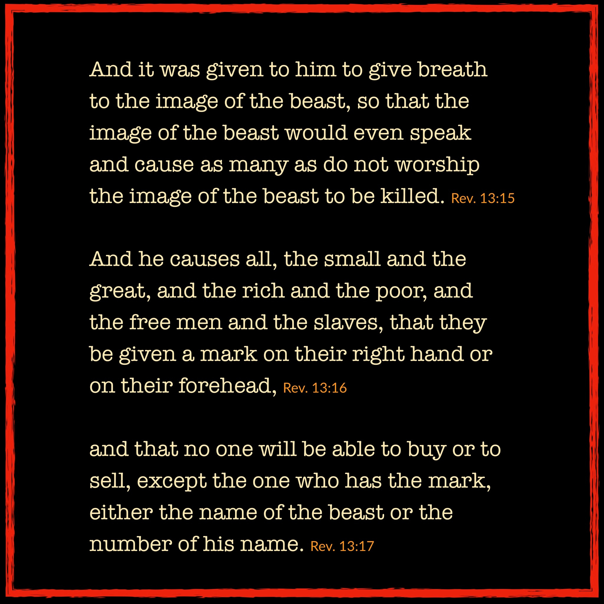 [16] All people were forced to put a mark on their right hand or forehead. Whether they were powerful or weak, rich or poor, free people or slaves, [17] they all had to have this mark, or else they could not buy or sell anything. This mark stood for the name of the beast and for the number of its name.