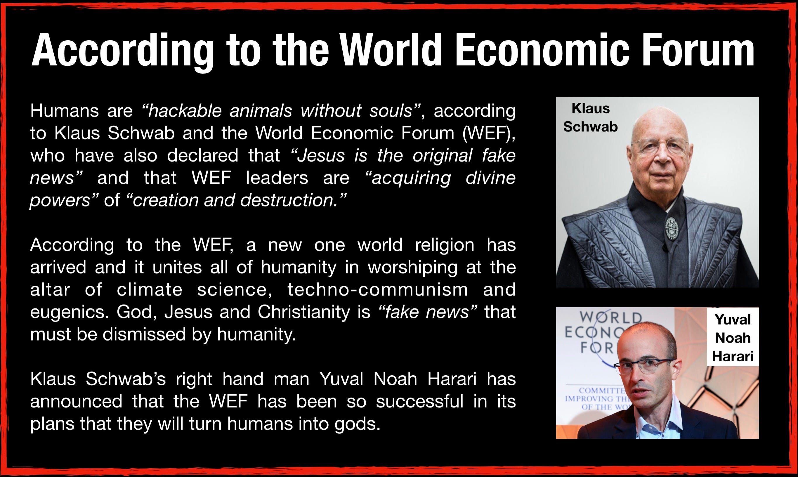 The World Economic Forum also declares “Jesus is the original fake news” and that WEF leaders are “acquiring divine powers” of “creation and destruction.”